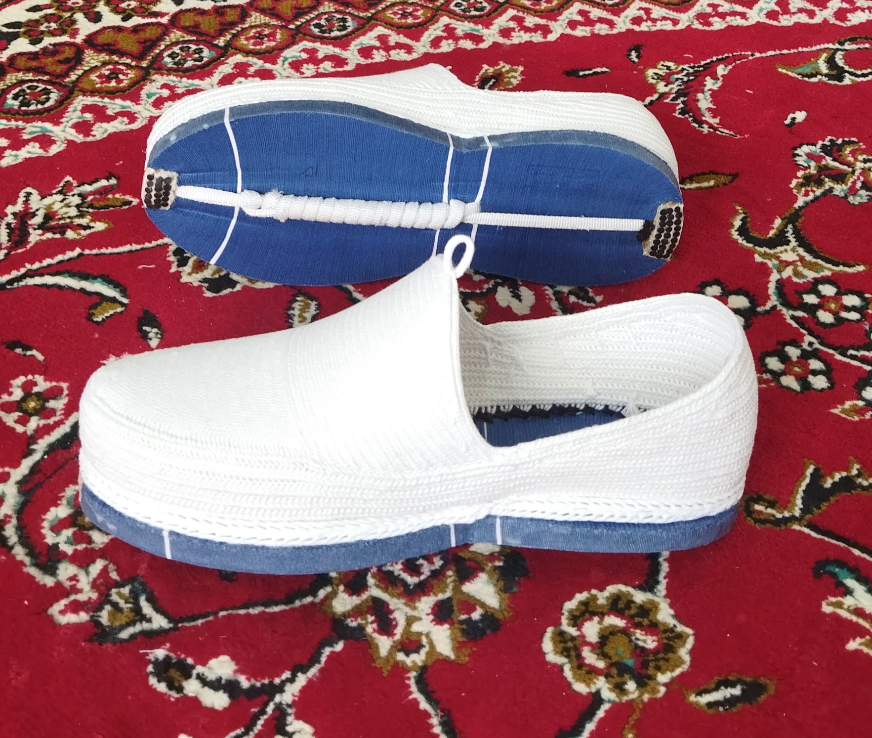 گیوه کلاش ، رنگ رویه سفید ، رنگ زیره آبی ، ضخامت زیره یک سانتیمتر